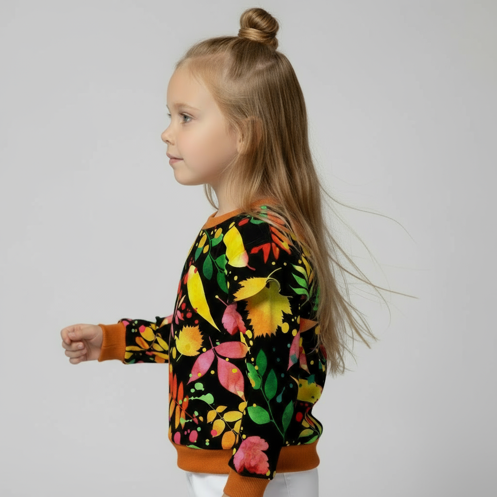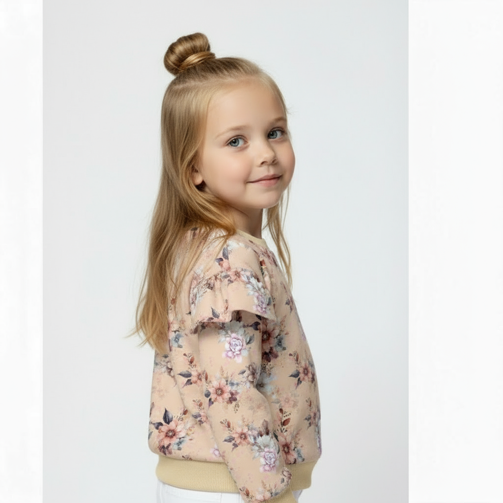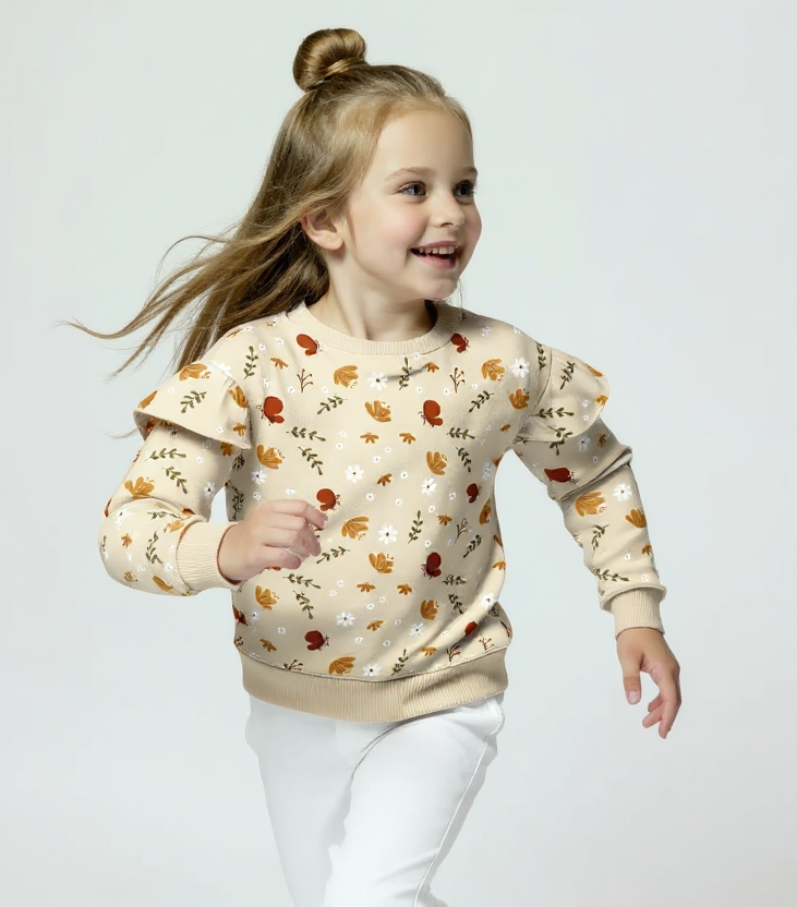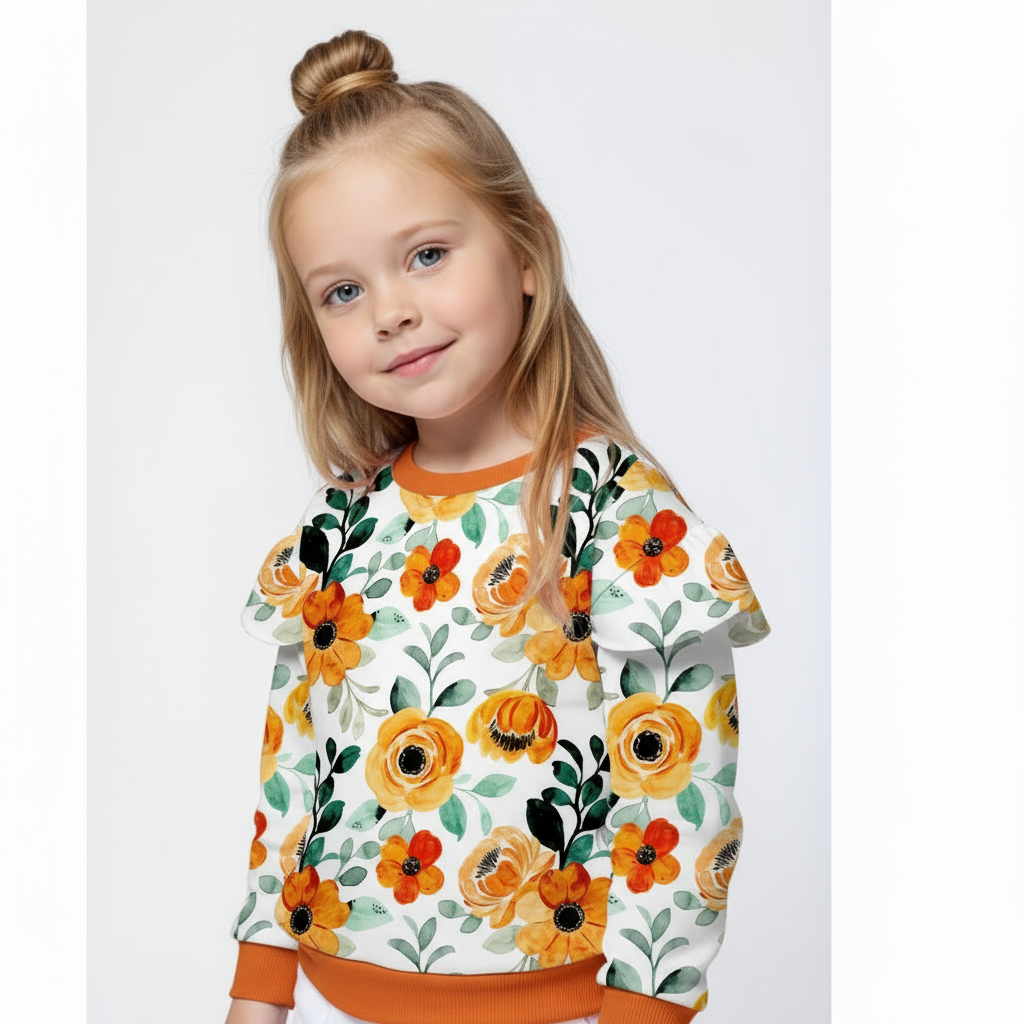 Bluza Bella z falbanką - beż, pomarańcz i kwiaty w rytmie jesieni. Rozmiar 86-122