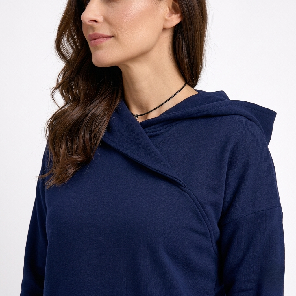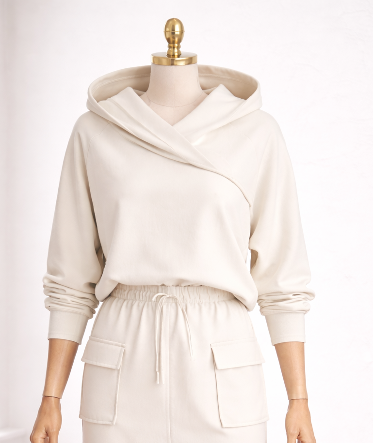 Charakterystyczny kaptur i subtelnie krzyżująca się linia dekoltu nadają całości nowoczesnego wyrazu, a jednocześnie zachowują ponadczasowość.