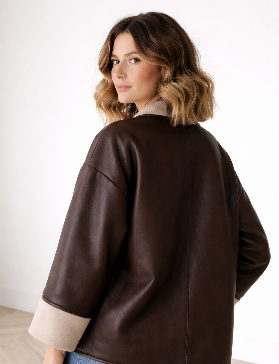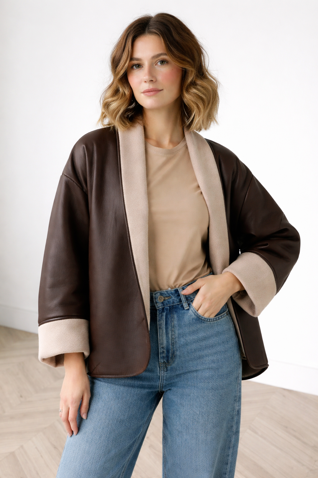 Uszyta z wysokiej jakości ekoskóry oraz drapanej dzianiny bawełnianej od wewnątrz, jest miękka, przyjemna w dotyku i daje naturalne ciepło — idealna na sezon przejściowy, chłodniejsze poranki, wieczory i wiosenne dni.