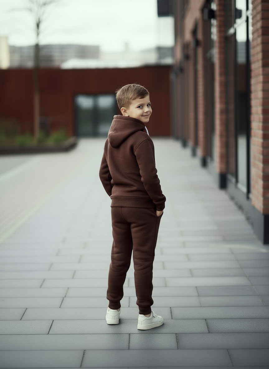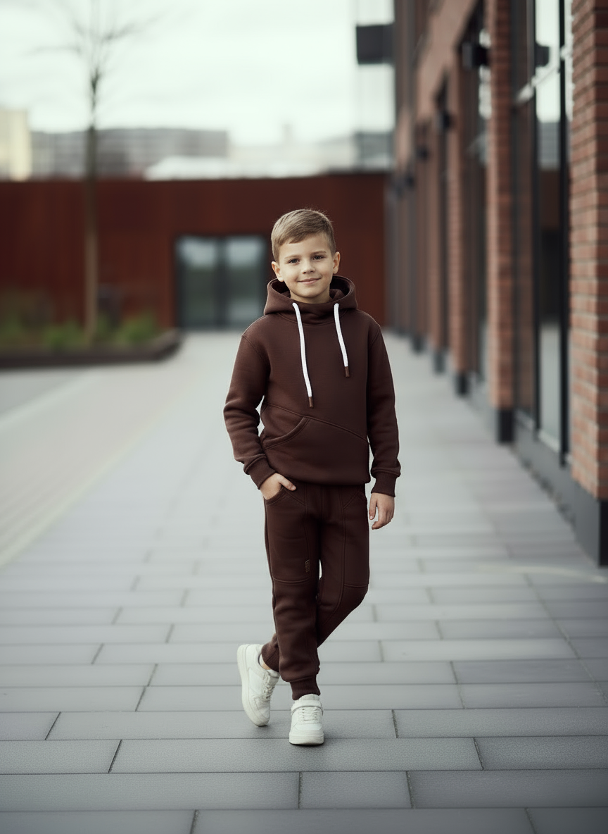 Komplet składa się z bluzy z kapturem oraz spodni dresowych.