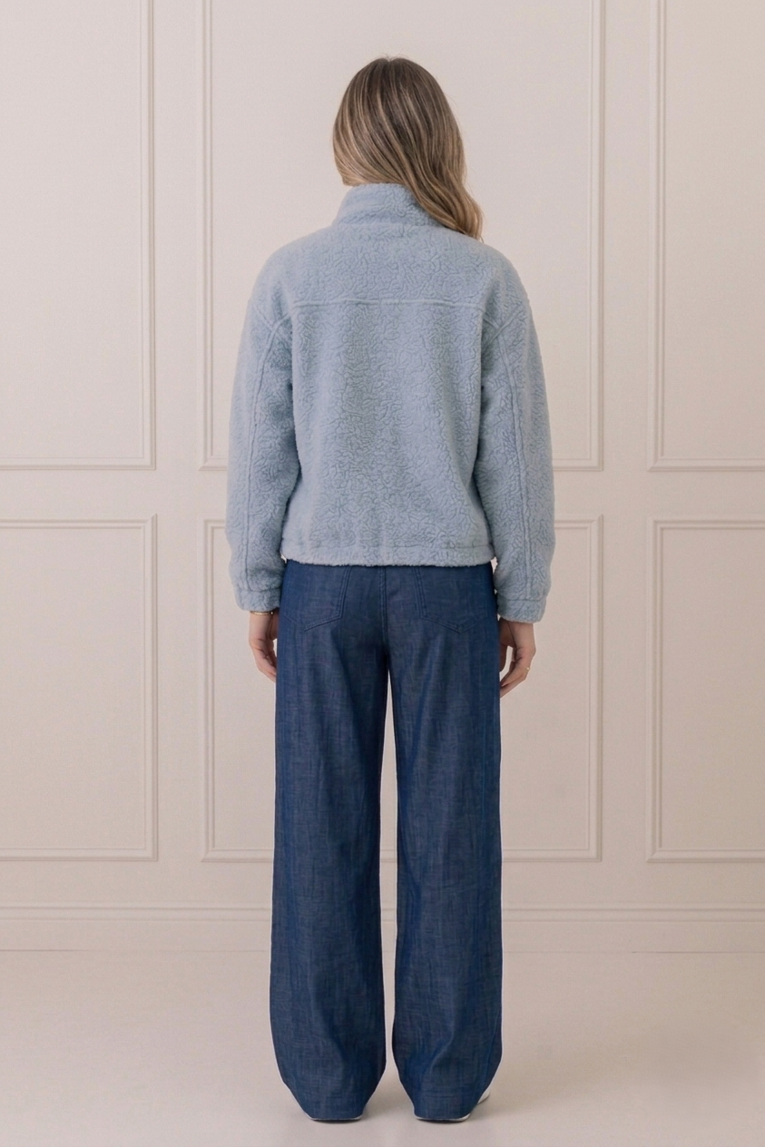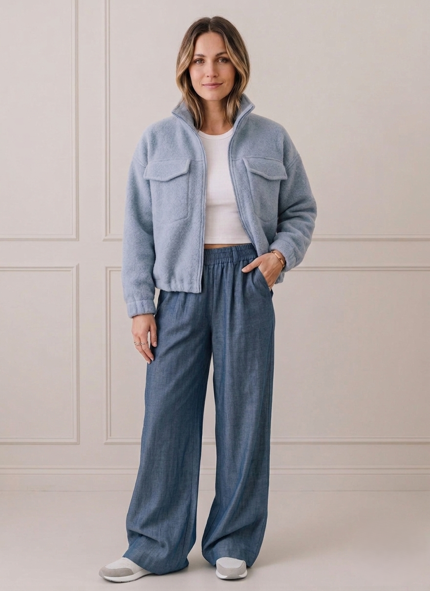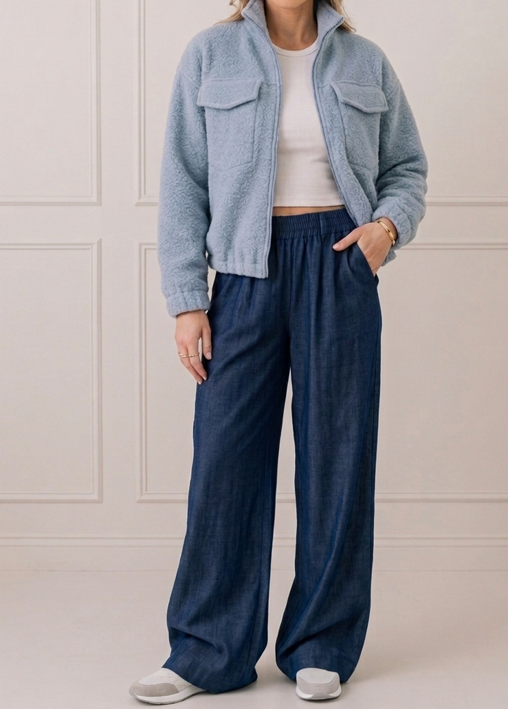 Szeroka nogawka nadaje sylwetce swobodę, a naturalna płynność materiału sprawia, że model wygląda lekko i nowocześnie.