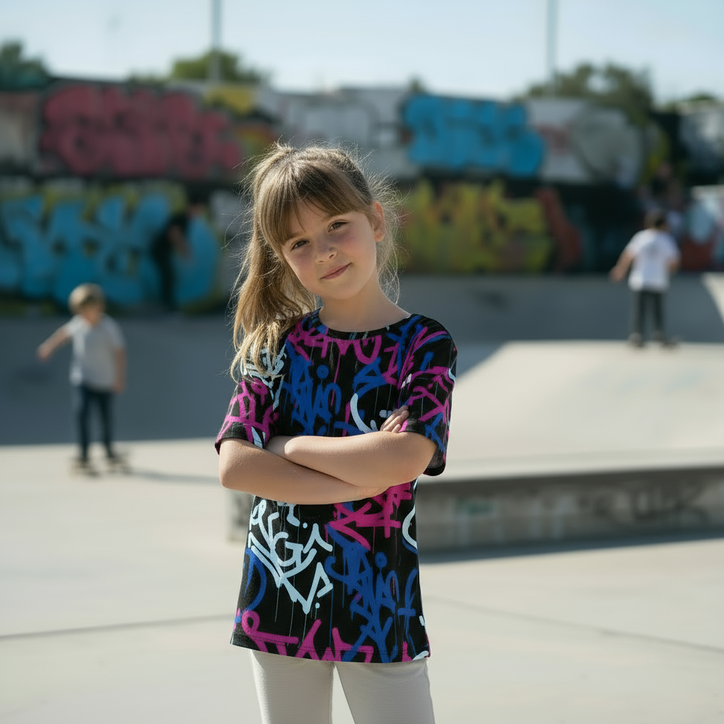 Tworzymy unikalne ubrania na wymiar, łącząc autorskie wzory z rysunkami dzieci oraz graffiti, co sprawia, że każdy projekt jest wyjątkowy i osobisty dla naszych klientów.